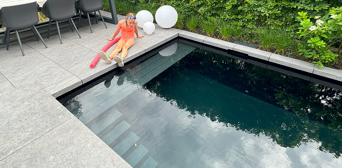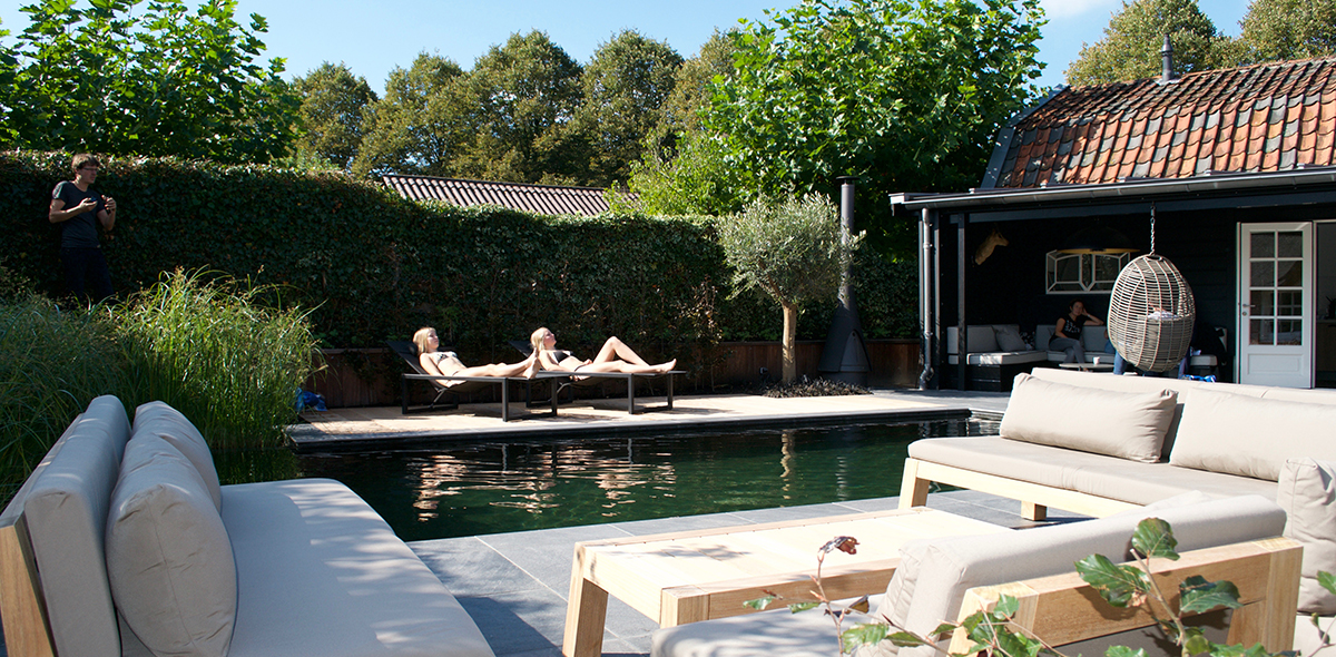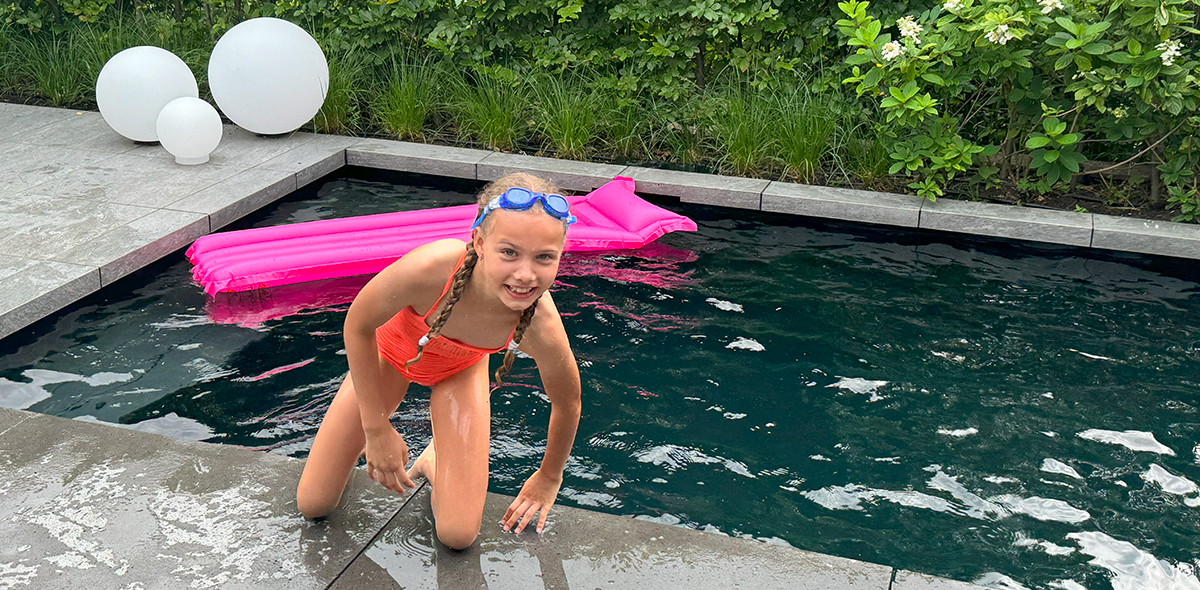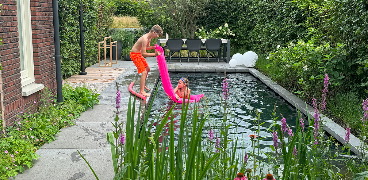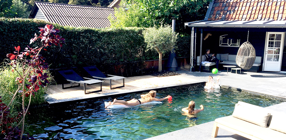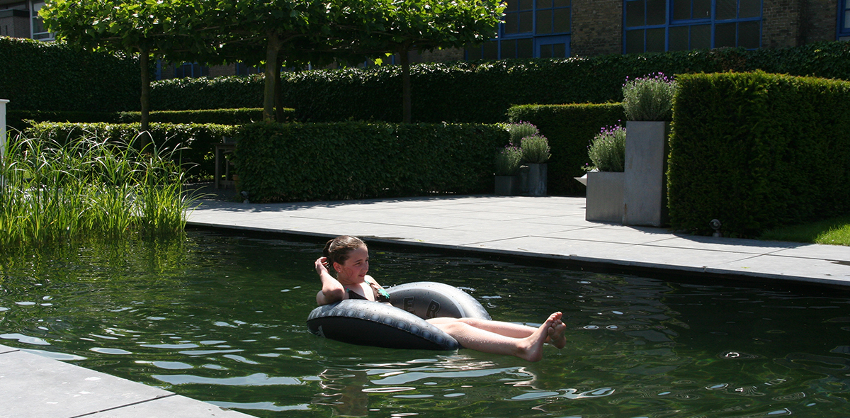 Een inbouw natuurlijke zwemgelegenheid van Naturlal Pools biedt verkoeling in de zomer en draagt bij aan een luxe en verzorgde uitstraling van de tuin. Trap en eventueel een onderwaterzitbank maken de zwemzone gemakkelijk toegankelijk vanaf het gazon of het aangrenzende terras of vlonder. Onderwater LED zwembadverlichting kan toe worden gevoegd voor meer sfeer en als u kiest voor een Luchtwarmtepomp kunt u de watertemperatuur zelf instellen.