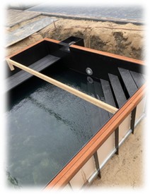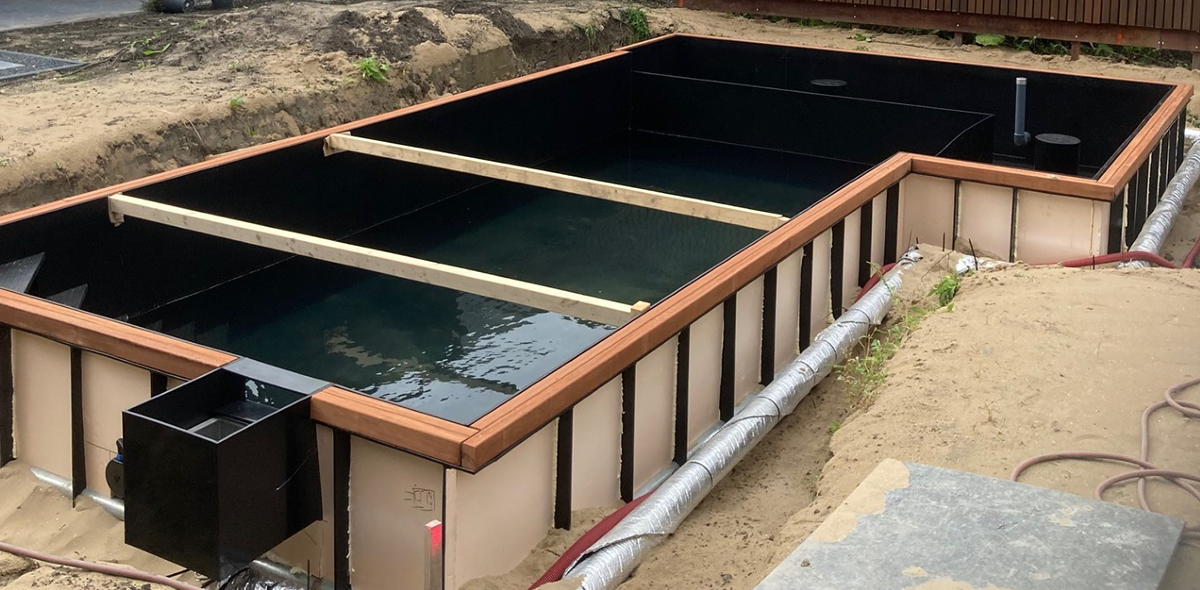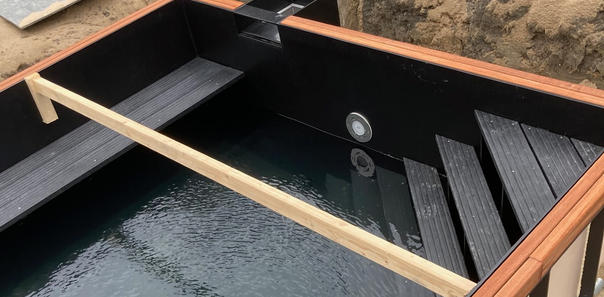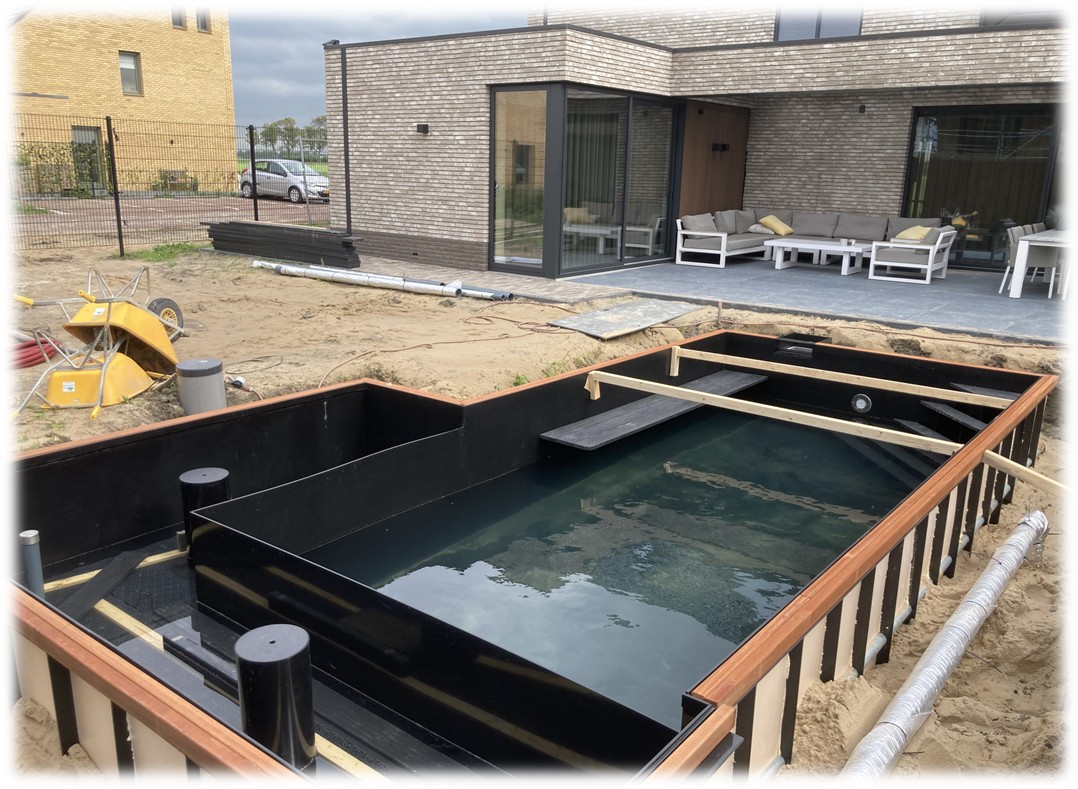 Plaatsen amphibievriendelijk voorfilter met Energiezuinige pomp en desinfectie unit, isoleren wanden en plaatsen PVC leidingwerk van techniek naar Natural Pools Plunge Pool.