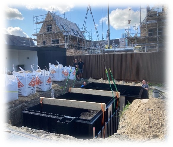 Opbouw binnenzijde regeneratiezone, plaatsen filtertonnen en geperforeerde bodem plaatsen en monteren overstort hemelwater, opvullen met substraat en aanplantwerkzaamheden.